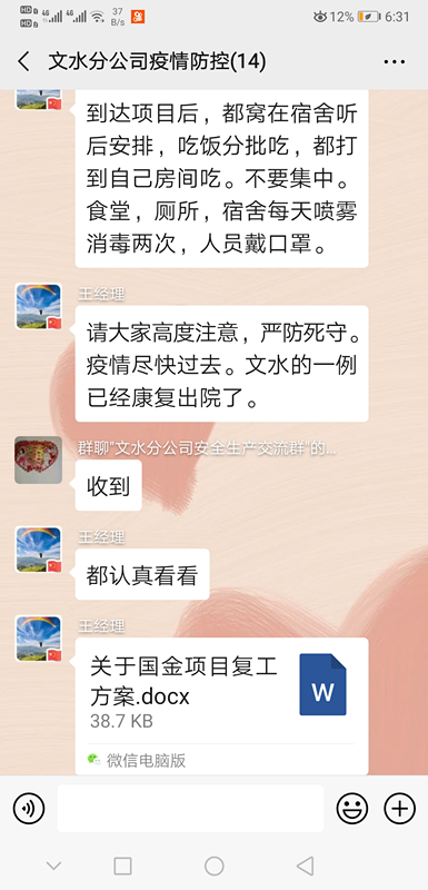 ---------文水分公司防疫防控工作 自新型冠狀病毒疫情爆發(fā)出現(xiàn),公司領(lǐng)導(dǎo)高度重視,為確保項(xiàng)目部能夠順利復(fù)工,以及職工能夠安全度過疫情期,文水分公司做了以下工作: 1、由王建立經(jīng)理統(tǒng)一領(lǐng)導(dǎo),分公司人員負(fù)責(zé)成立疫情防控小組,制定復(fù)工方案協(xié)助業(yè)主開展防疫工作。新型冠狀病毒感染的肺炎疫情防控工作的處置由疫情防控工作領(lǐng)導(dǎo)小組統(tǒng)一領(lǐng)導(dǎo),全體人員無條件服從領(lǐng)導(dǎo)小組的指揮調(diào)度。以職工根本利益為出發(fā)點(diǎn)和落腳點(diǎn),依照法律法規(guī)和政策辦事,防止因處置不當(dāng)而造成疫情蔓延事件發(fā)生。