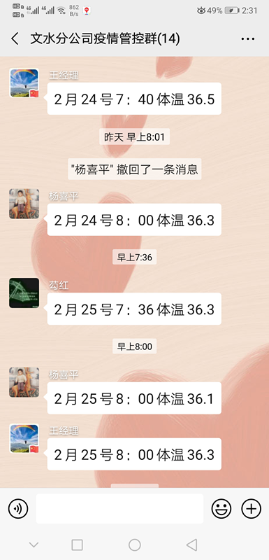 3、利用微信建群,做好公司疫情信息的搜集統(tǒng)計(jì)與分析工作,每日報(bào)告體溫由專門負(fù)責(zé)人統(tǒng)計(jì)信息并報(bào)送總公司、業(yè)主、當(dāng)?shù)赜嘘P(guān)部門。