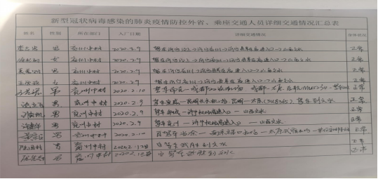 8、我們做了員工排查,建立返崗人員登記制度對返回人員登記,每天微信群詳細(xì)記錄職工身體狀況、假期外出情況、與重點(diǎn)疫區(qū)人員接觸情況等信息;對每名員工近14天的去向進(jìn)行排查;對來自或去過疫情重點(diǎn)地區(qū)的員工建立重點(diǎn)監(jiān)控清單,規(guī)勸其留在當(dāng)?shù)貢翰粡?fù)工,鼓勵(lì)員工延遲上班;對來自或去過疫情重點(diǎn)地區(qū)的員工排查其抵達(dá)時(shí)間,按規(guī)定落實(shí)醫(yī)學(xué)觀察、隔離等措施,確保其隔離觀察14天并經(jīng)體溫檢測正常、無不適癥狀后方可上崗。進(jìn)入崗位工作前自覺接受體溫檢測,體溫正常方可進(jìn)入工作區(qū),并洗手消毒。嚴(yán)格執(zhí)行各項(xiàng)疫情防控要求,建立和落實(shí)復(fù)工上崗前個(gè)人防護(hù)知識培訓(xùn),多種方式普及傳染病防護(hù)知識,做到有癥狀早發(fā)現(xiàn)、早報(bào)告、早隔離、早治療。