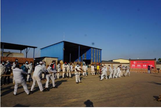 舉行以各生產部門為團隊的拔河比賽,圖片為中方員工組成團隊與贊方員工比賽圖。